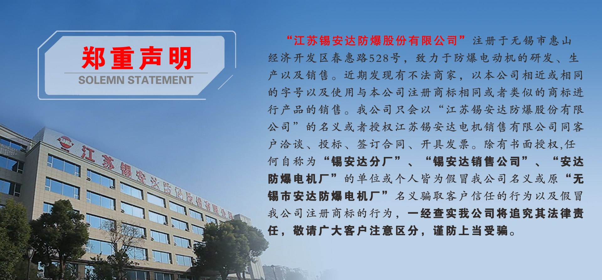 公司主要生產(chǎn)高低壓防爆電動(dòng)機(jī)和防爆電動(dòng)葫蘆,是中國防爆電機(jī)科研生產(chǎn)基地之一,占地面積11萬平方米,擁有現(xiàn)代化的生產(chǎn)車間、先進(jìn)的加工設(shè)備和完善的檢測能力。具有1000萬千瓦防爆電動(dòng)機(jī)和3000臺防爆電動(dòng)葫蘆的生產(chǎn)能力,注冊商標(biāo)為“錫安達(dá)”。產(chǎn)品主要用于石油、化工、煤炭、冶金、水利、電力、糧食、軍工等領(lǐng)域。